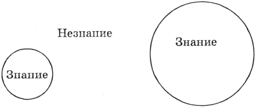 Так, объем знаний выпускника школы гораздо больше, чем объем знаний первоклассника, однако и граница его незнания существенно больше. Действительно, первоклассник ничего не знает о законах физики и поэтому не осознает недостаточности своих знаний, тогда как выпускник школы при подготовке к экзаменам по физике может обнаружить, что существуют физические законы, которые он не знает или не понимает.