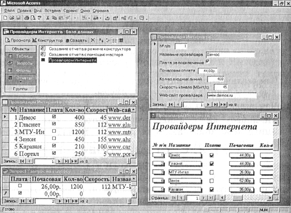 Окно базы данных - один из главных элементов интерфейса Access. Здесь систематизированы все объекты БД: таблицы, запросы, формы, отчеты, макросы и модули. В данном случае открыто и активно окно Провайдеры Интернета: база данных.