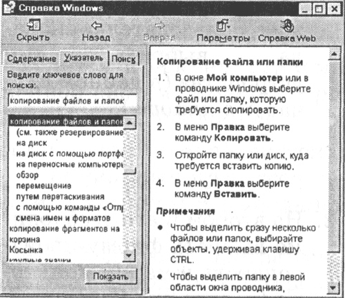 Воспользуемся вкладкой Указатель для поиска информации о способах копирования файлов и папок. Для этого: