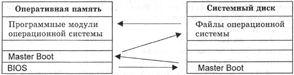 Если диск системный и программа-загрузчик оказывается на месте, то она загружается в оперативную память и ей передается управление работой компьютера. Программа ищет файлы операционной системы на системном диске и загружает их в оперативную память в качестве программных модулей (рис. 4.20).