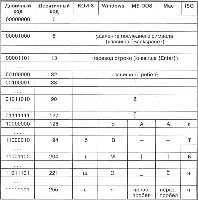 Каждая кодировка задается своей собственной кодовой таблицей. Как видно из табл. 1.3, одному и тому же двоичному коду в различных кодировках поставлены в соответствие различные символы.