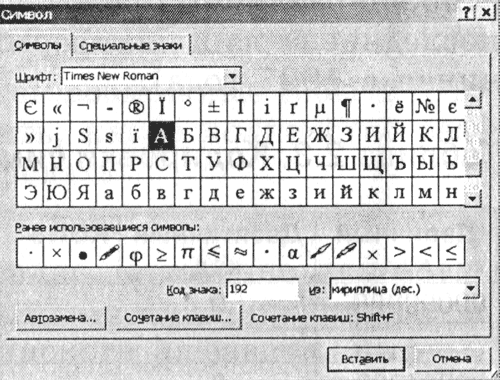 1. Запустить текстовый редактор MS Word 2002. Ввести команду [Вставка-Символ...]. На экране появится диалоговая панель Символ. Центральную часть диалогового окна занимает таблица символов для определенного шрифта (например, Times New Roman).
