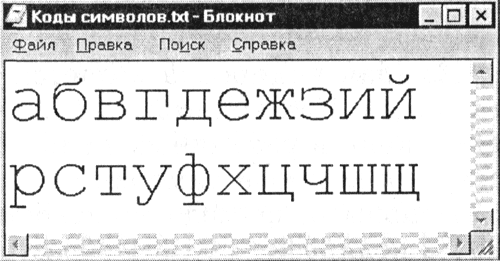 1. Запустить стандартную программу Блокнот. С помощью дополнительной цифровой клавиатуры при нажатой клавише {Alt} ввести число 0224, отпустить клавишу {Alt}. В документе появится символ "а". Повторить процедуру для числовых кодов от 0225 до 0233. В документе появится последовательность из 12 символов "абвгдежзий" в кодировке Windows (CP1251).