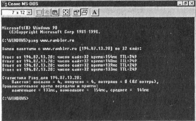 3. В окне Сеанс MS-DOS высветится результат пробного прохождения сигнала в четырех попытках. Время отклика характеризует скоростные параметры всей .цепочки линий связи от сервера до локального компьютера.