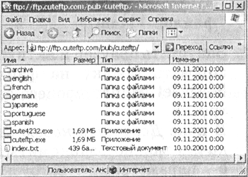 1. Запустить браузер. В поле Адрес ввести URL, например: ftp://ftp.cu-teftp.com/pub/cuteftp/.