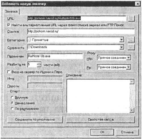 В поле Добавить новую закачку можно ознакомиться с параметрами загрузки файла и изменить URL, папку на локальном компьютере, количество разбиений файла и др. Щелкнуть по кнопке ОК.