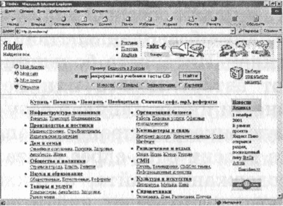 Наиболее мощными поисковыми системами общего назначения в русскоязычной части Интернета являются серверы Rambler (http://www.rambler.ru), Апорт (http://www.aport.ru), и Яндекс (http://www.yandex.ru), а по всему Интернету - сервер Yahoo (адрес http://www.yahoo.com).