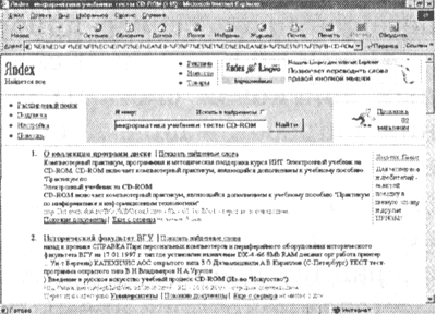 1. В браузере открыть начальную страницу поискового сервера Яндекс. В поле поиска ввести ключевые слова, например "информатика учебники тесты CD-ROM".