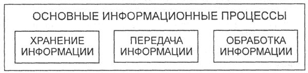 Основные информационные процессы. А теперь зададимся вопросом: что делает человек с полученной информацией? Во-первых, он ее стремится сохранить: запомнить или записать. Во-вторых, он передает ее другим людям. В третьих, человек сам создает новые знания, новую информацию, выполняя обработку данной ему информации. Какой бы информационной деятельностью люди не занимались, вся она сводится к осуществлению трех процессов: хранению, передаче и обработке информации (рис. 1.3).