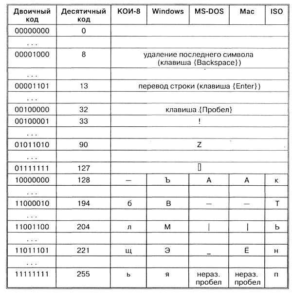 Различные кодировки знаков. Присваивание знаку конкретного двоичного кода - это вопрос соглашения, которое фиксируется в кодовой таблице. В существующих кодовых таблицах первые 33 кода (десятичные коды с 0 по 32) соответствуют не знакам, а операциям (перевод строки, ввод пробела и т. д.).