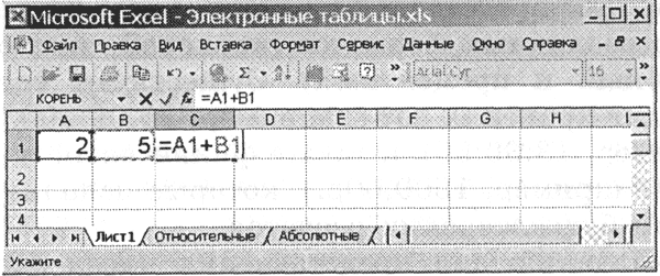 В процессе ввода формулы она отображается как в самой ячейке, так и в строке формул (рис. 1.1). После окончания ввода, которое обеспечивается нажатием клавиши {Enter}, в ячейке отображается не сама формула, а результат вычислений по этой формуле.