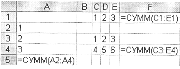 | Рис. 1.2. Суммирование значений диапазонов ячеек |