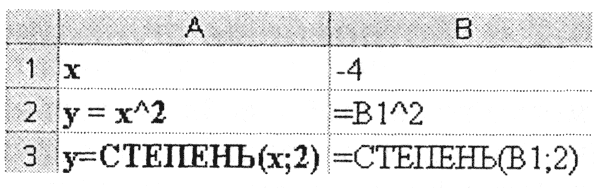 Например, если в ячейке В1 хранится значение аргумента х функции, то вид функции, введенной с клавиатуры (ячейка В2), будет =B1^2, а введенной с помощью мастера функций (ячейка ВЗ) - СТЕПЕНЬ(В1;2) (рис. 1.3).