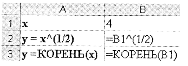 Например, если в ячейке В1 хранится значение аргумента х функции, то вид функции, введенной с клавиатуры (ячейка В2), будет =В1^(1/2), а введенной с помощью мастера функций (ячейка ВЗ) - =КОРЕНЬ(В1) (рис. 1.4).