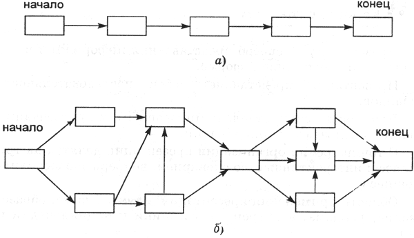 | Рис. 1.6. Схема презентации - множество слайдов и связей между ними: а - простейшая структура, б - сложная структура (многовариантный сценарий) |
