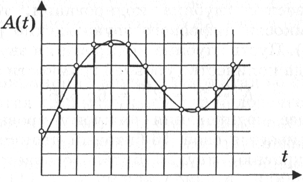 Таким образом, непрерывная зависимость громкости звука от времени A(t) заменяется на дискретную последовательность уровней громкости. На графике это выглядит как замена гладкой кривой на последовательность "ступенек" (рис. 1.2).