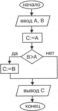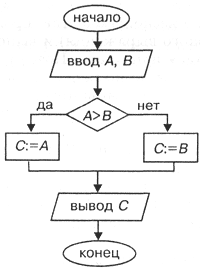 Нетрудно понять смысл этого алгоритма. Если значение переменной А больше, чем В, то переменной С присвоится значение А. В противном случае, когда А < В, переменной С присвоится значение В.