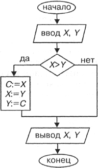 Следующая задача: упорядочить значения двух переменных X и Y по возрастанию. Смысл этой задачи следующий: если для исходных значений переменных справедливо отношение X < Y (например, X = 1, Y = 2), то оставить их без изменения; если же X > Y (например, X = 2, Y = 1), то выполнить обмен значениями.