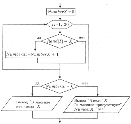 На рис. 3.14 приведена блок-схема алгоритма поиска в массиве Rand величины X с подсчетом числа его вхождений в массив в переменной NumberX.