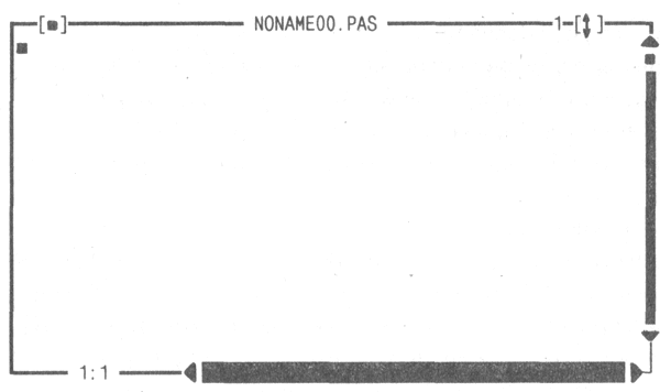 В середине верхней части рамки размещается имя файла, помещенного в окно для редактирования. Если у файла имени нет (создается новый файл), ему присваивается условное имя NONAME с соответствующим порядковым номером, начиная с нуля. Если файл имеет такое имя, то при записи на диск это имя нужно будет переопределить (при этом расширение можно не указывать - файлу автоматически будет присвоено расширение .PAS). Если один и тот же файл открыт одновременно в нескольких окнах, то кроме имени файла отображается также и номер копии.