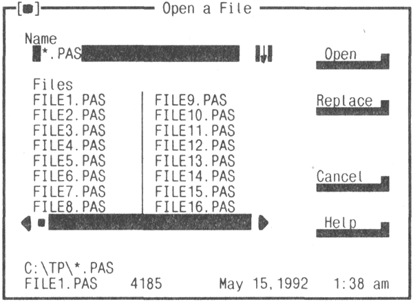 Кнопки управления окна (на рис. 6 - кнопки Open, Replace, Cancel и Help) служат для выполнения определенных действий в процессе работы с окном. Обычно три кнопки - OK, Cancel и Help - являются стандартными и присутству- ют практически у всех окон диалога (правда, в рассматриваемом примере кнопки ОК нет, но она присутствует в примере на рис. 7). Применение кнопки ОК означает, что внесенные изменения в процессе работы с окном являются правильными и их следует запомнить в среде. Кнопка Cancel отменяет все внесенные изменения и оставляет то состояние параметров, которое.было до обращения к окну диалога. Кнопка Help позволяет использовать контекстную помощь. У окна могут быть и другие кнопки управления (например, Open и Replace в рассматриваемом примере), позволяющие выполнять те или иные дополнительные действия. Для того чтобы выполнить конкретное действие, связанное с кнопкой, следует курсор "мыши" поместить на эту кнопку и нажать левую клавишу. Возможен и другой способ использования кнопок. Выбрать соответствующую кнопку можно, нажимая клавишу табуляции Tab (или комбинацию Shift+Tab). Соответствующая кнопка высветится другим по сравнению с остальными кнопками цветом. Далее для выполнения действий, связанных с этой кнопкой, необходимо нажать клавишу Enter. Кнопка ОК, если она присутствует, используется по умолчанию (выбирать ее не нужно, достаточно лишь нажать клавишу Enter).