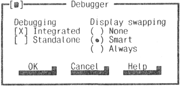 Для того чтобы установить в триггерном списке тот или иной параметр либо сбросить его, следует курсор "мыши" поместить на строчку с этим параметром и нажать левую клавишу. В этом случае в квадратных скобках перед параметром появится символ X (см. на рис. 7 параметр Integrated - интегрированный отладчик), означающий, что данный параметр выбран. Если теперь повторно нажать левую клавишу, символ X пропадет, что означает, что данный параметр не используется (см. другие параметры того же списка). Для выбора параметра в селективном списке следует поступить аналогичным образом, только после нажатия левой клавиши теперь уже в круглых скобках, стоящих перед выбираемым параметром, появится символ ? (см. на рис. 7 параметр Smart - высвечивать по мере необходимости). При этом аналогичный символ, стоящий перед каким-либо другим параметром списка пропадет, т. к. в селективном списке можно выбрать только один параметр. Повторное нажатие левой клавиши "мыши" ни к чему не приведет. Те же операции можно выполнить и с помощью клавиатуры. Для этого сначала следует выбрать требуемый список, нажатиями клавиши Tab или комбинации Shift+Tab, как это производилось для кнопок управления, а затем клавишами "стрелка вниз" или "стрелка вверх" выбрать соответствующий параметр. В триггерном списке после этого необходимо нажать клавишу пробела.