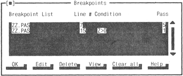 Это окно (Breakpoints) имеет список выбора и шесть кнопок управления. Список выбора содержит следующую информацию о всех точках останова: имя файла, в котором задана точка останова (Breakpoint List); номер строки файла, в которой задана точка останова (Line); условие, при котором осуществляется останов (Condition), - этого параметра может и не быть; безусловная точка останова; номер попадания в точку останова, при котором действительно происходит останов в данной точке (Pass), - если этот параметр равен нулю, останов происходит при любом попадании в эту точку, если к тому же не задано условие останова.