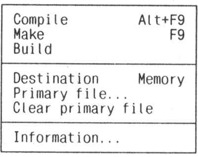 Окна меню обеспечивают ветвящуюся структуру меню интегрированной среды. Сюда же в версии 7.0 добавлено локальное меню, связанное с правой клавишей "мыши". Пример окна меню Compile (компиляция) приведен на рис. 9.