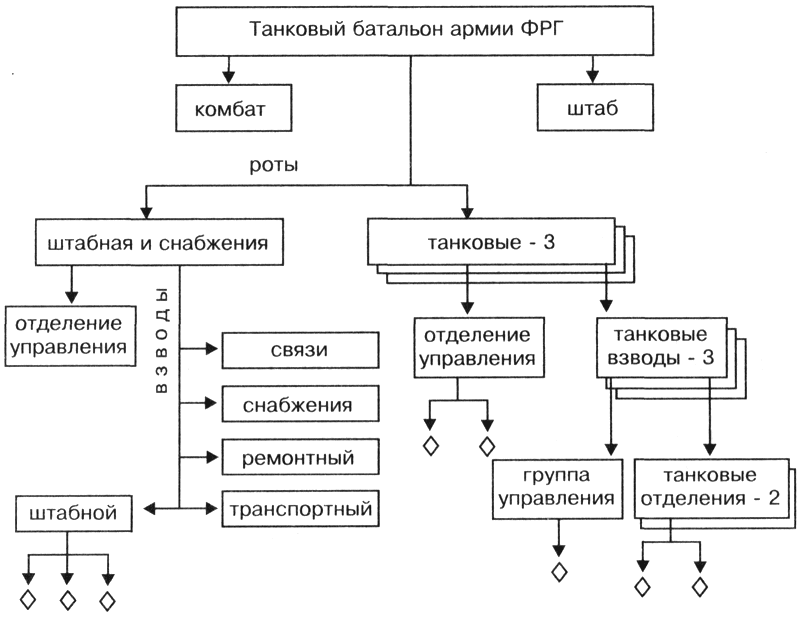 На рис. 5 приведена схема организации танкового батальона ФРГ по состоянию на середину 70-х гг. XX в. Ромбиками обозначены танки, входящие в то или иное подразделение. Подсчитайте количество танков в танковой роте и общее количество танков в батальоне.